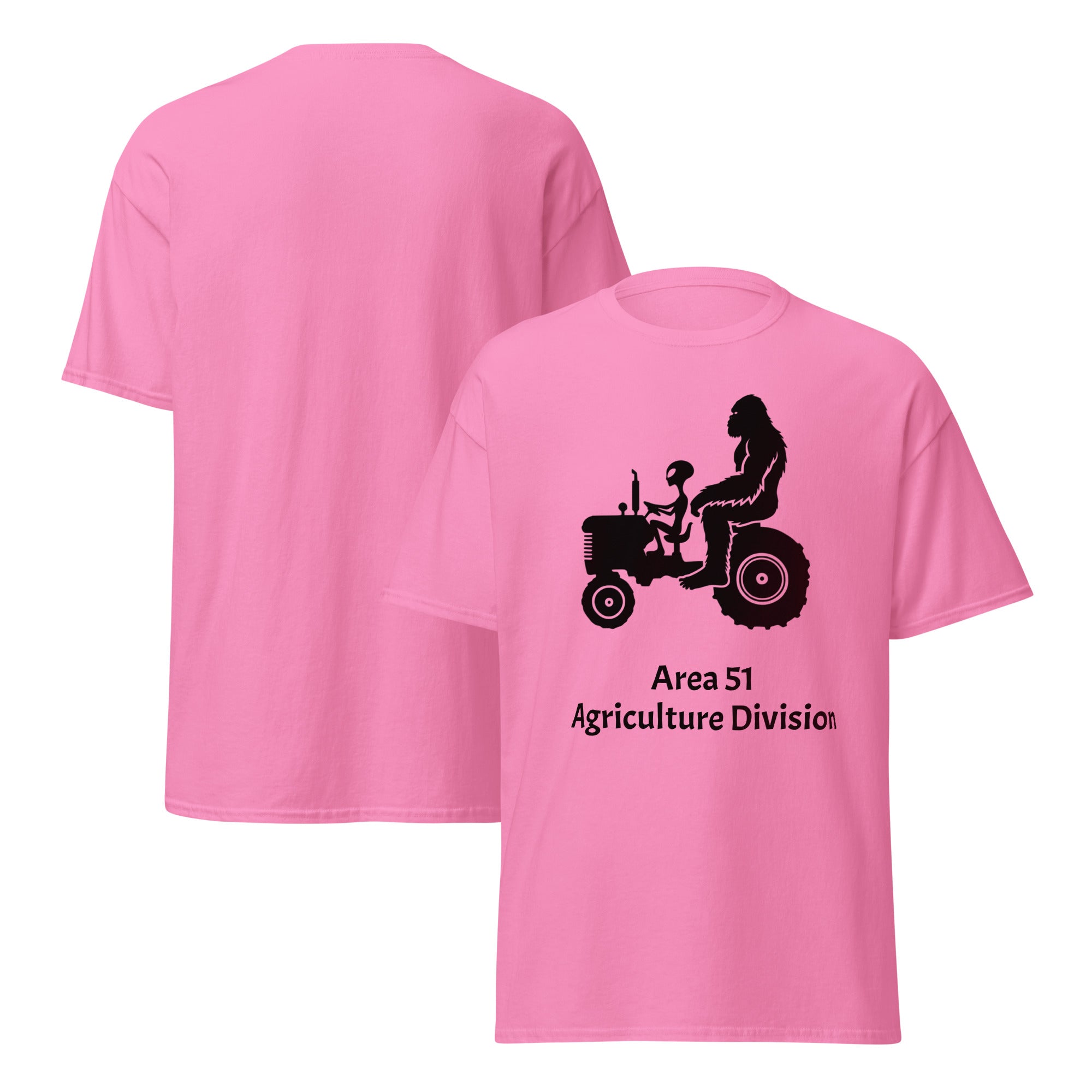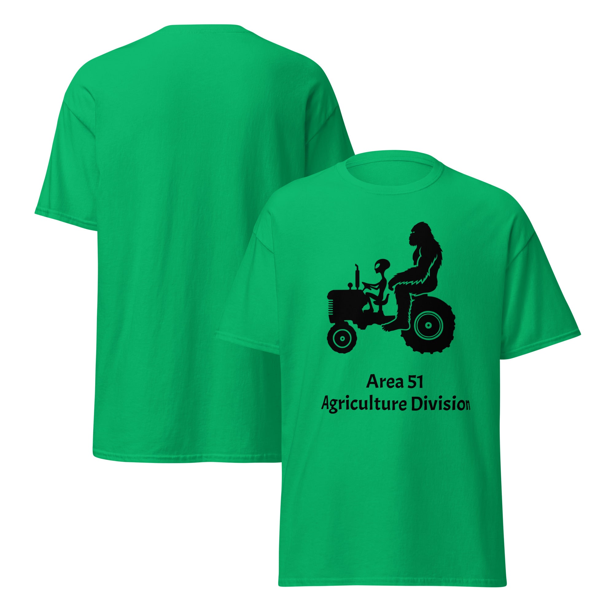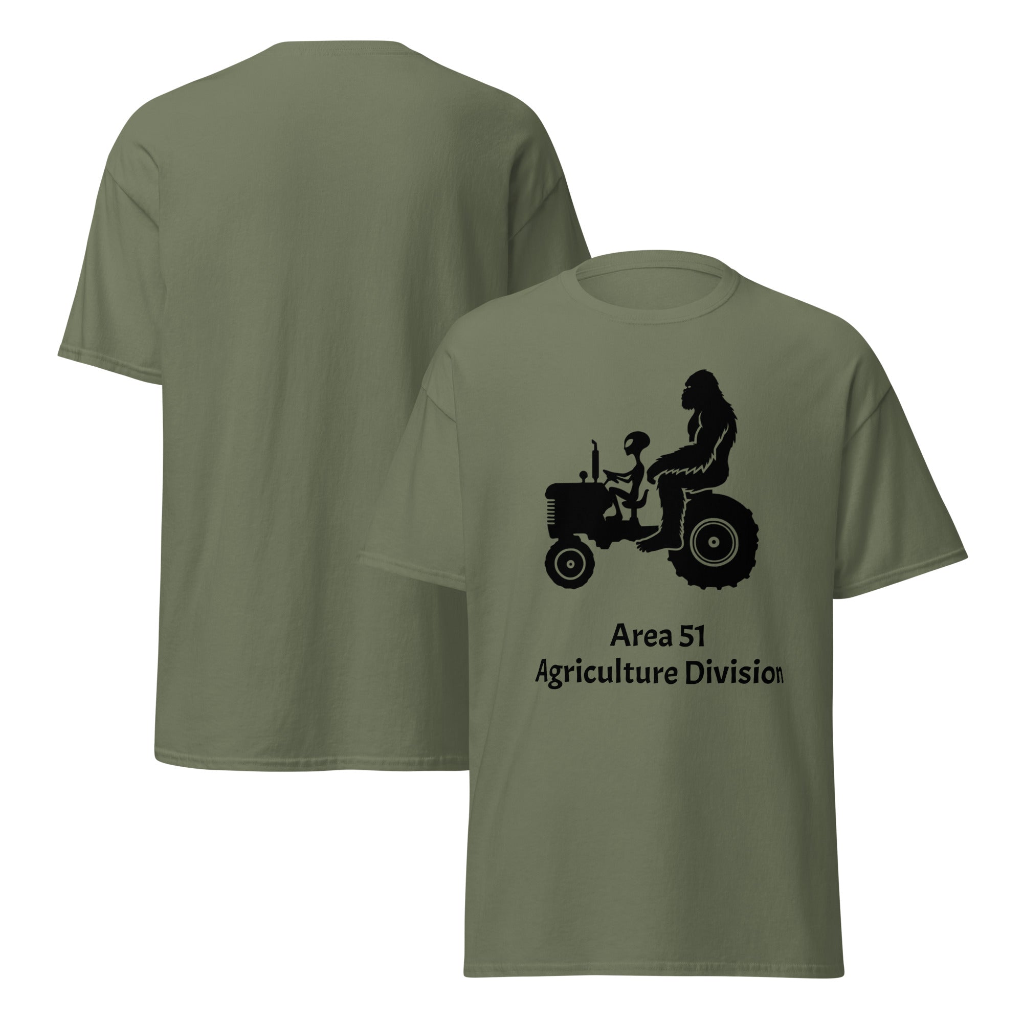 This shirt features a silhouette of Bigfoot and an alien riding a tractor together, proudly representing the “Area 51 Agriculture Division.” It’s the perfect blend of sci-fi humor, rural charm, and tongue-in-cheek conspiracy fun. Soft, durable, and made for everyday wear, it’s ideal for believers, farmers, night-shifters, and anyone who loves a clever twist on extraterrestrial lore.