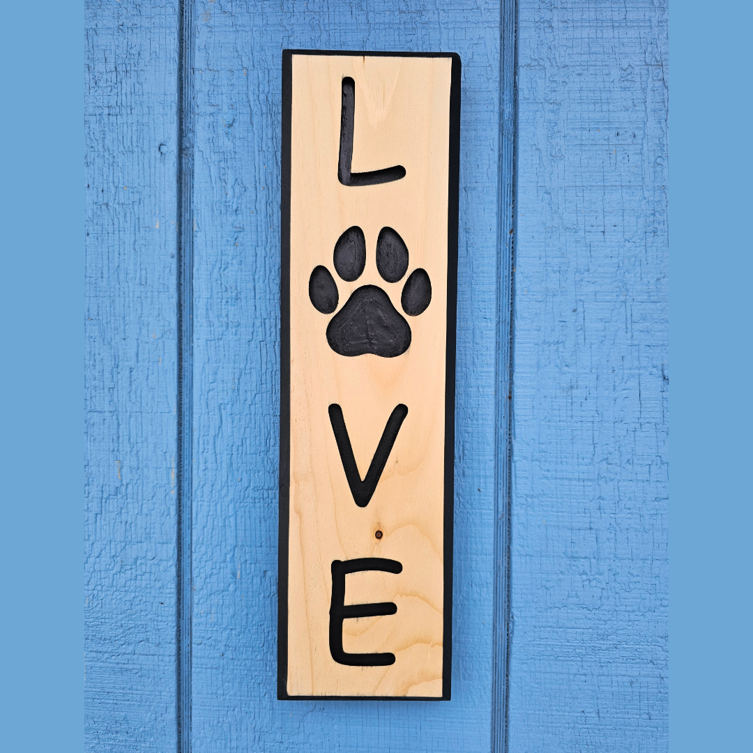 Celebrate your love for pets with this handcrafted vertical wooden sign, CNC routered for precision and charm. The word LOVE is engraved vertically, with a playful paw print replacing the “O” — the perfect touch for any animal lover’s home.