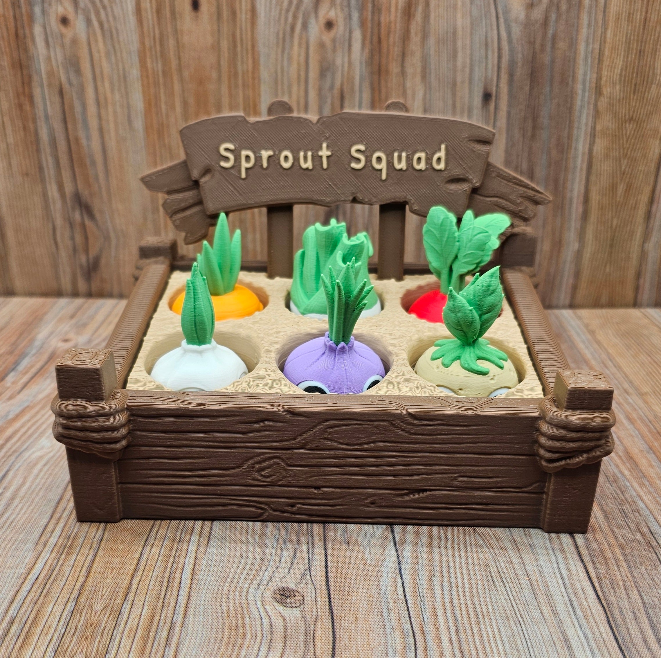 This 3D printed display set includes a garden base with a “Sprout Squad” sign and six adorable vegetable characters: Oli the Onion, Pete the Potato, Lee the Leek, Rad the Radish, Cora the Carrot, and Gilly the Garlic. Each veggie has its own unique facial expression, giving every member of the squad its own charm.