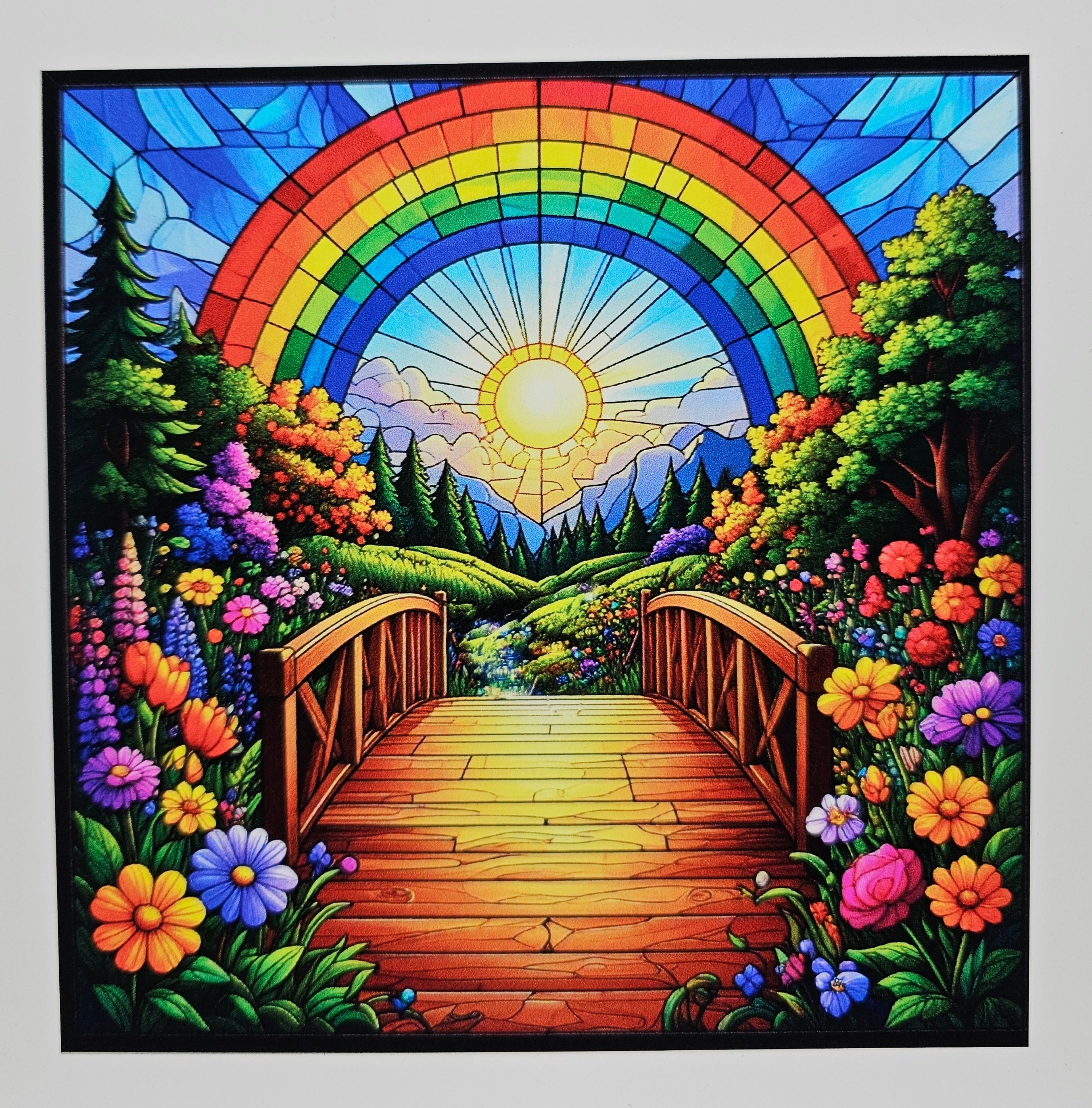 A heartfelt memorial scene featuring the iconic Rainbow Bridge—perfect for honoring the pets who’ve left pawprints on your heart. A gentle, glowing tribute when backlit.