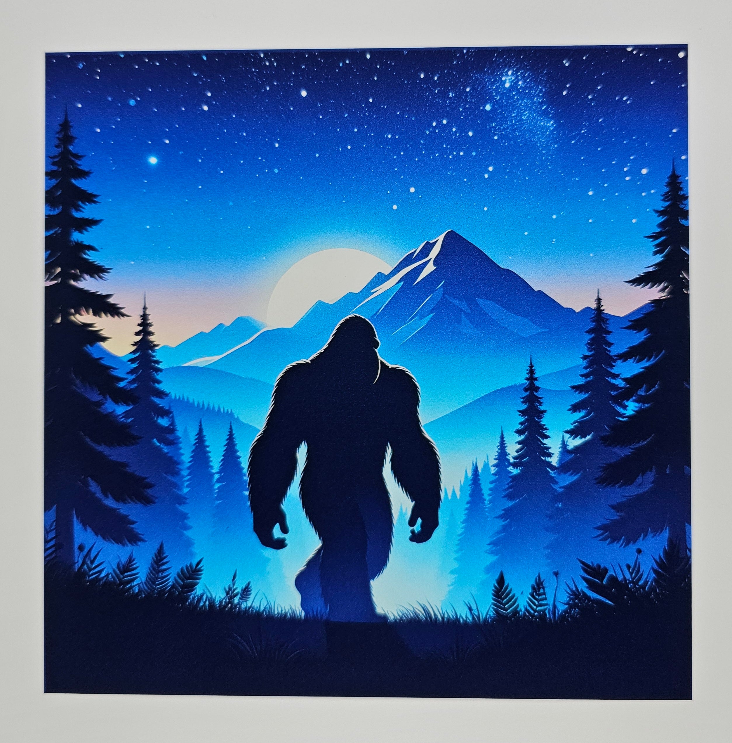 A fun and whimsical scene featuring the legendary Bigfoot roaming the forest. Ideal for lovers of folklore, cryptids, and woodland-themed décor.