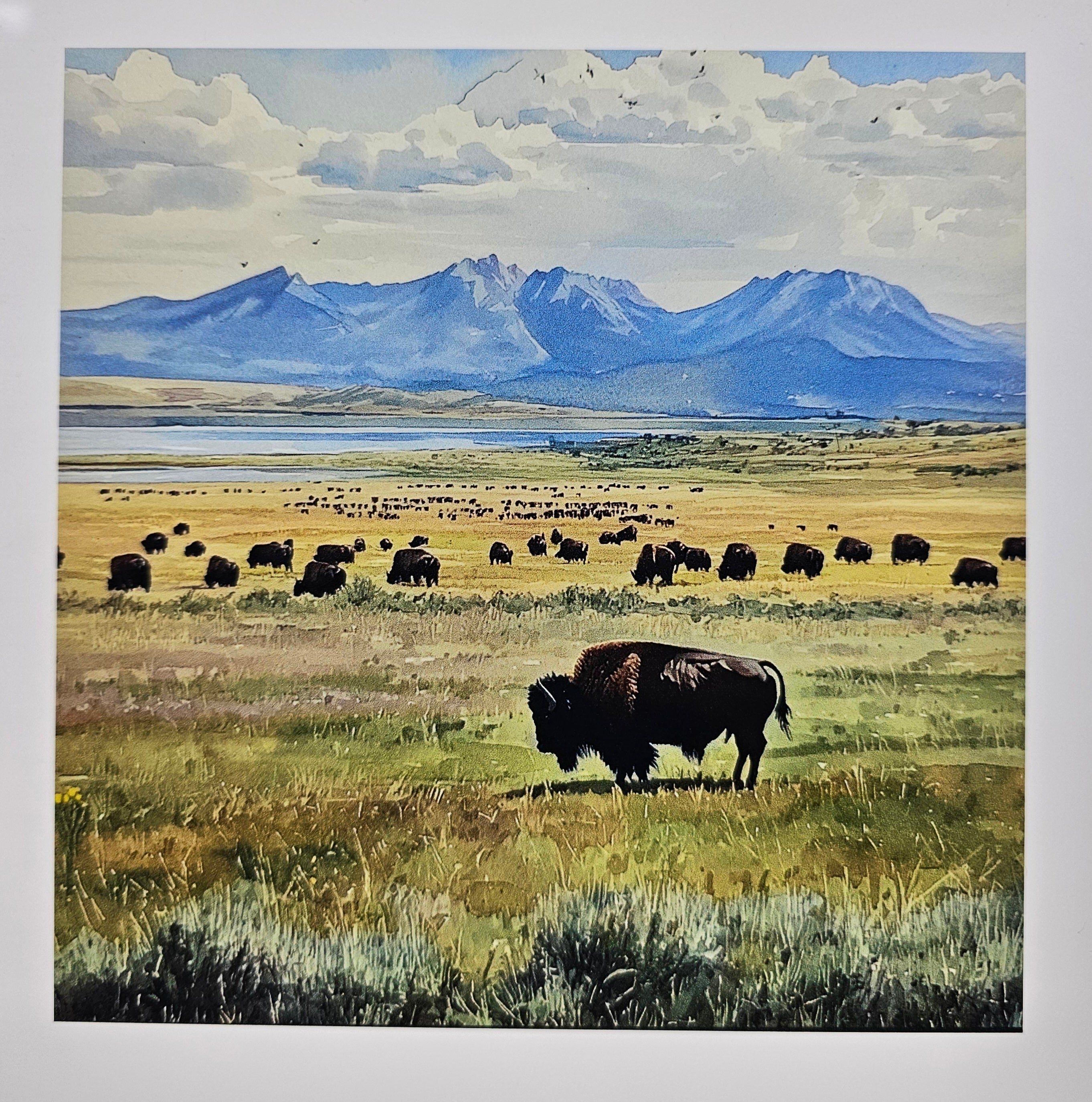 A powerful silhouette of a herd of bison against a wide-open landscape. A striking choice for western, rustic, or wildlife-inspired spaces.